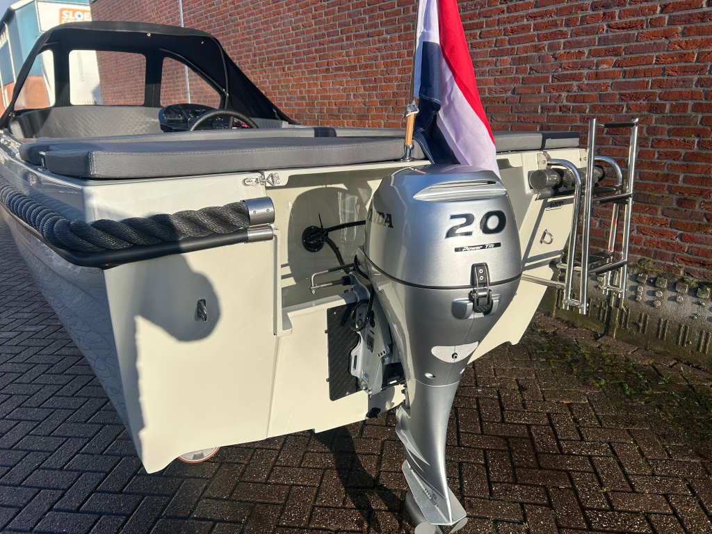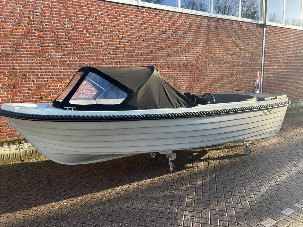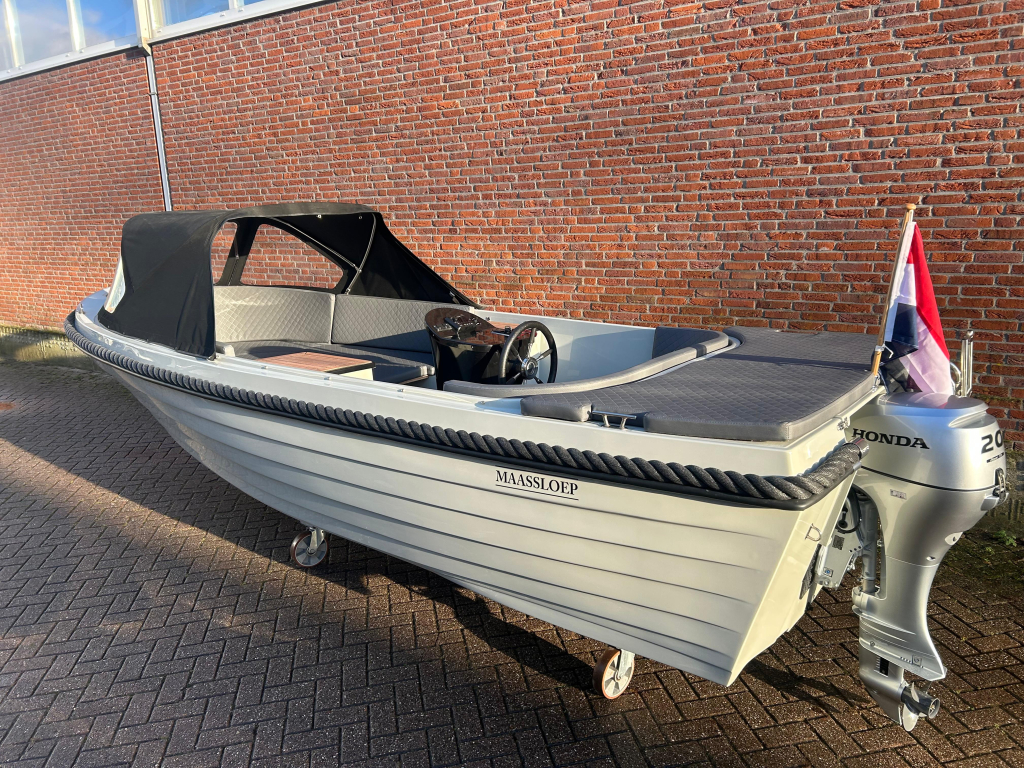 Zo goed als nieuwe Maassloep 540 met 20PK honda buitenboordmotor met trim.